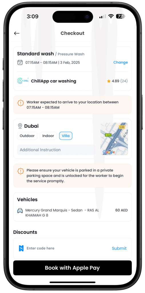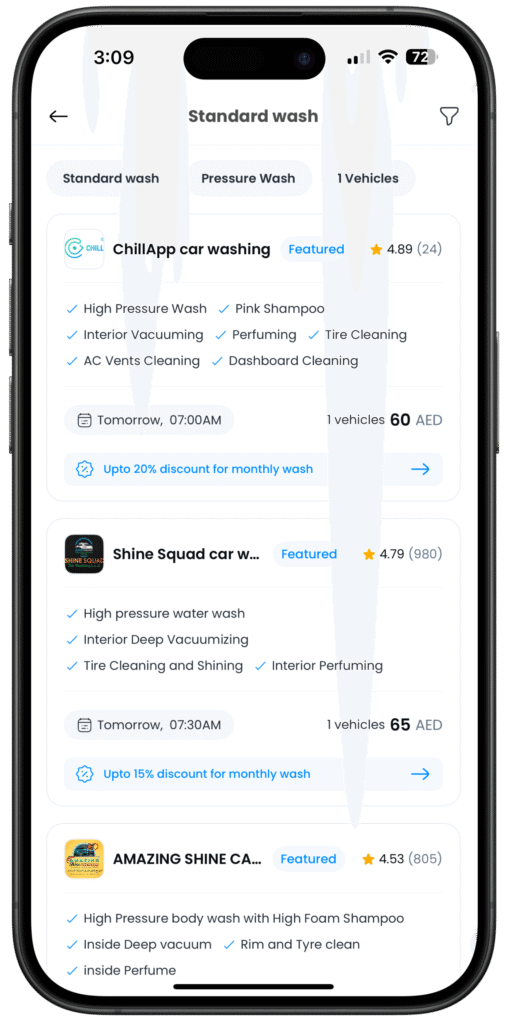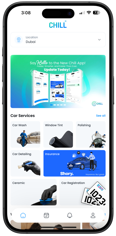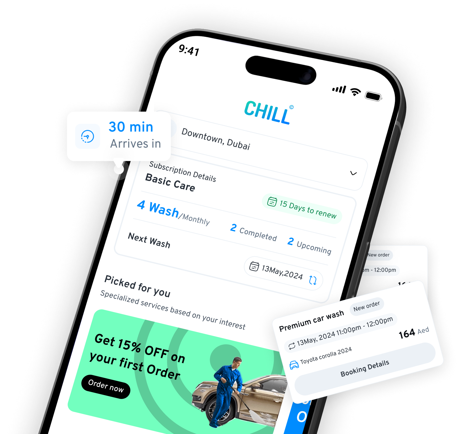 Chill makes car upkeep effortless with a wide range of on-demand services across the UAE. Whether you need a premium car wash, detailing, tinting, or roadside assistance, our platform connects you with trusted providers in just a few taps.